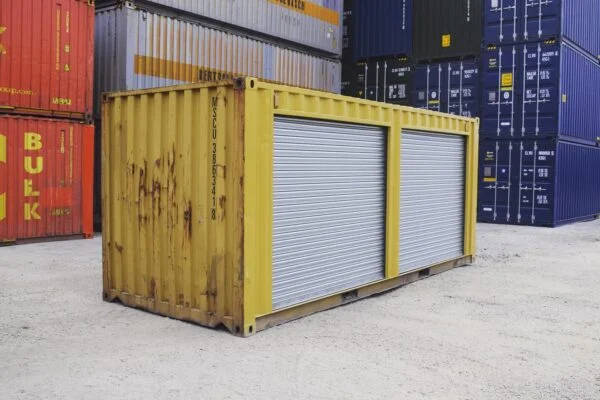 Turn heads and boost accessibility with this vibrant yellow 20ft used shipping container, equipped with two heavy-duty side roll-up doors, perfect for easy loading, organized storage, or mobile business setups.